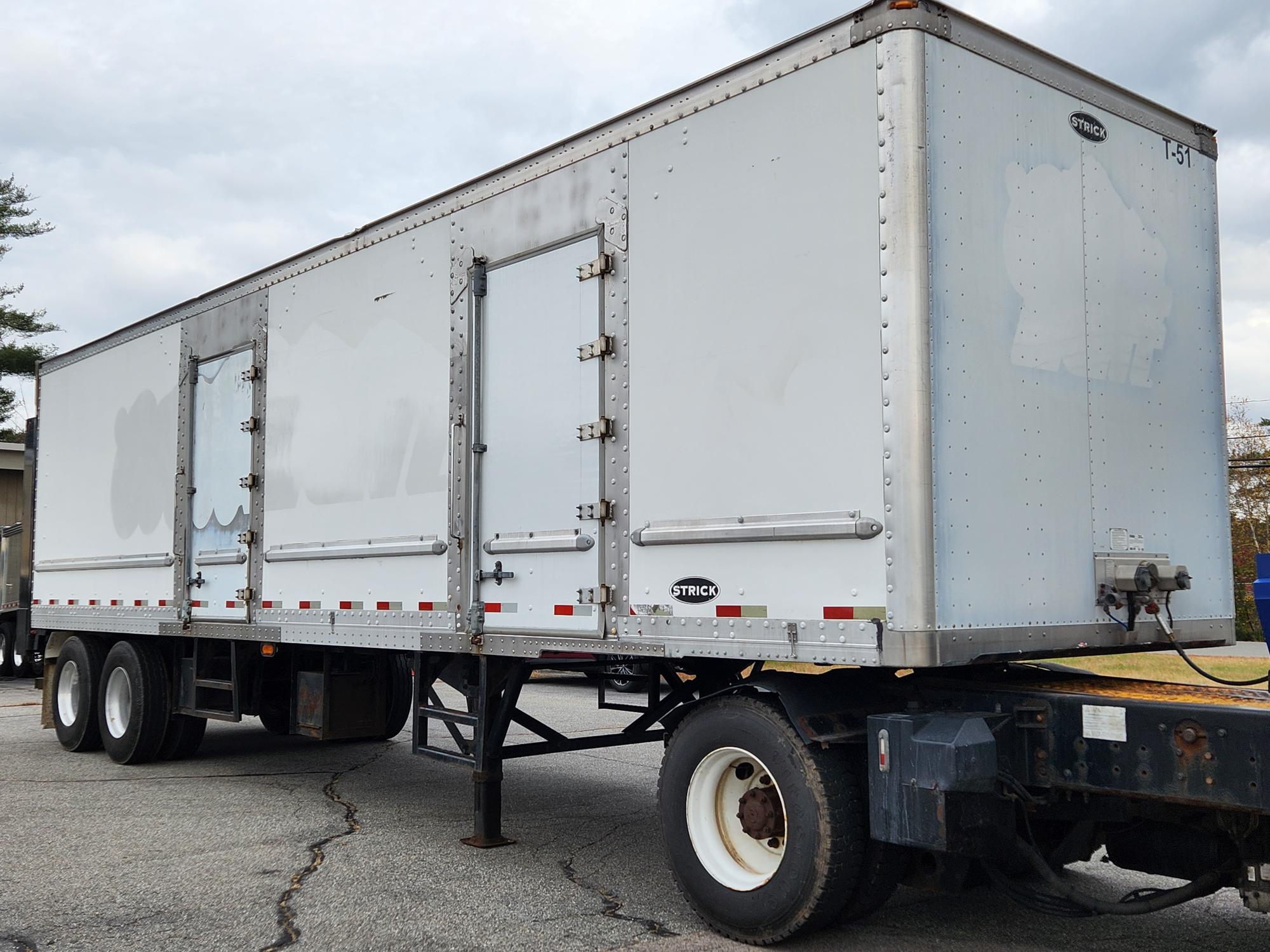 Quantity of (2) 2011 model Strick 36′ beverage delivery trailers. 102” wide x 12’6” OAH, 3/8” SS pick up coupler plate, Roll-up rear door, (2) curbside doors and (1) roadside door. Side door threshold plates and stainless steel side door framing, Steel scuff liner, translucent roof, ceiling scuff protection. 12” roof bow spacing, Rub rail on HD 1” FRP side walls, 1.5” laminated hardwood oak floors, 8” crossmember spacing, Tandem axle spring suspension, 11R22.5 on alum. outer wheels, Maxon BMR55 Rail gates operational, 5500# capacity, S/P $ 15,000. each